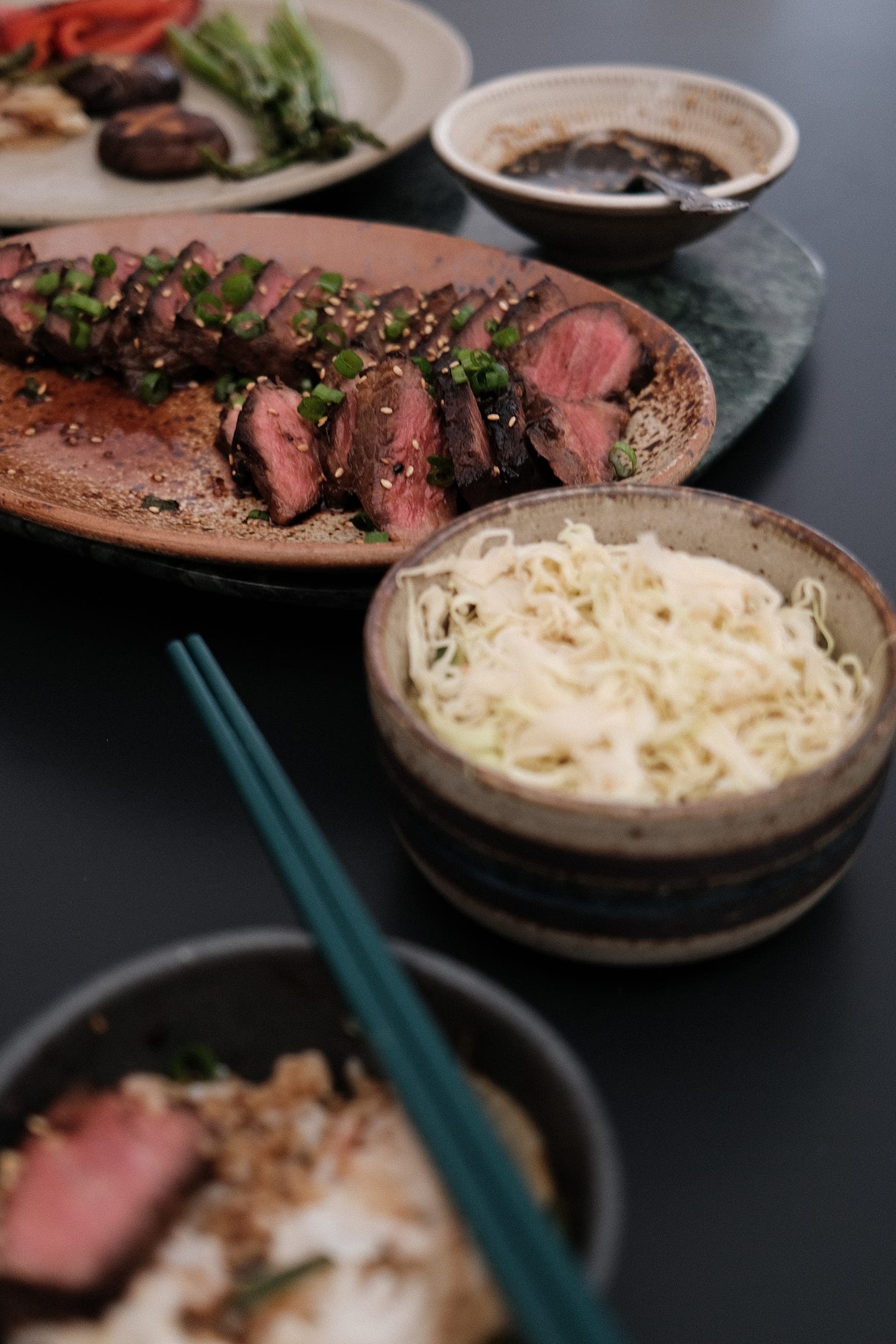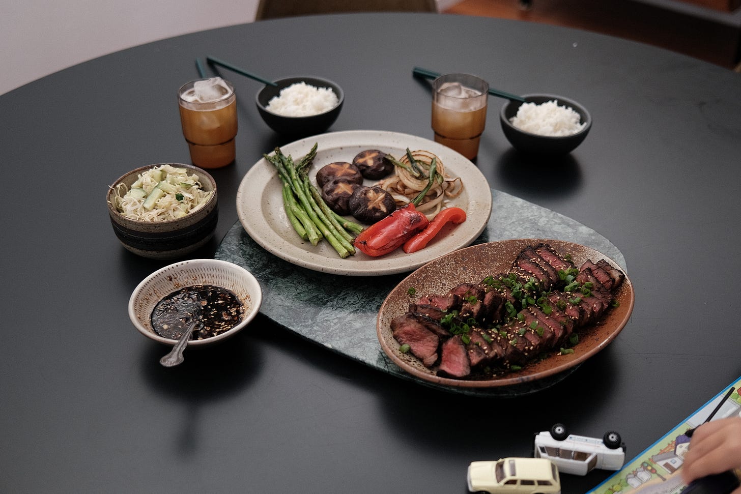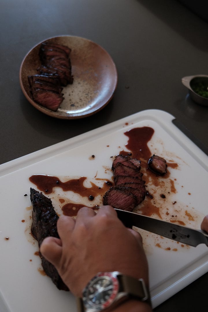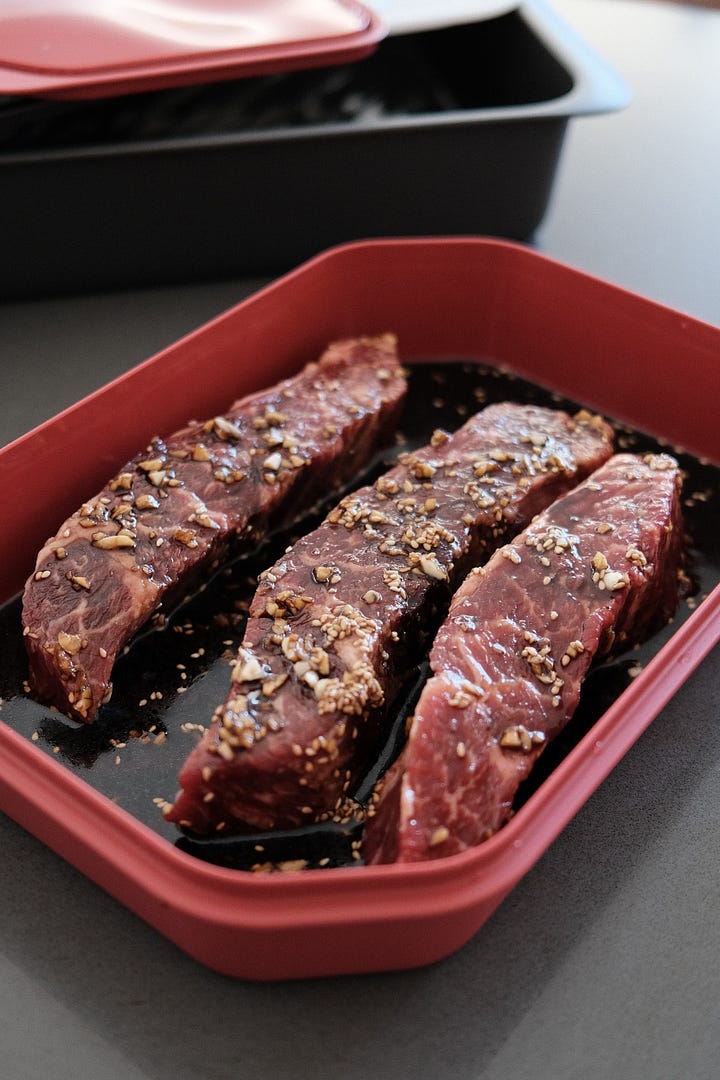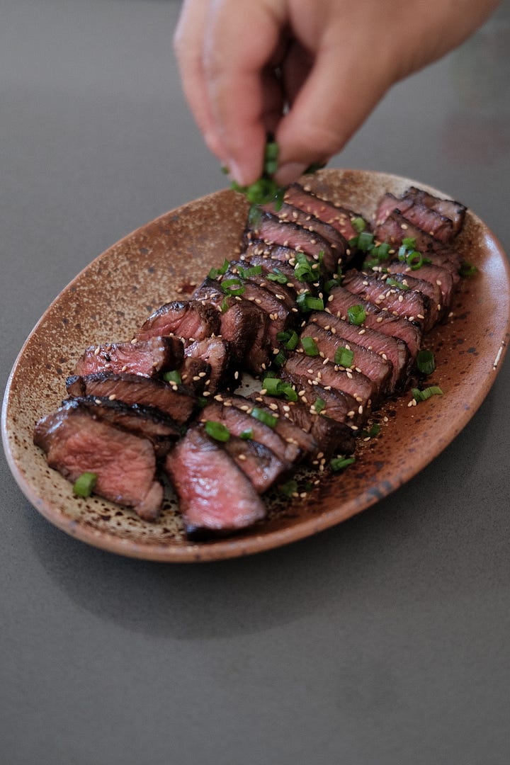 So we’re bringing you Japanese BBQ at home with marinated steak, assorted veggies, and a savory-sweet dipping sauce, or tare. Over the years, we’ve refined our approach, learning which cuts work best, which veggies pair well, and the perfect ratio for our tare. Our must haves for veggies are mushrooms and sweet peppers because they char beautifully. And of course, a good dipping sauce can elevate even the simplest spread into something special.