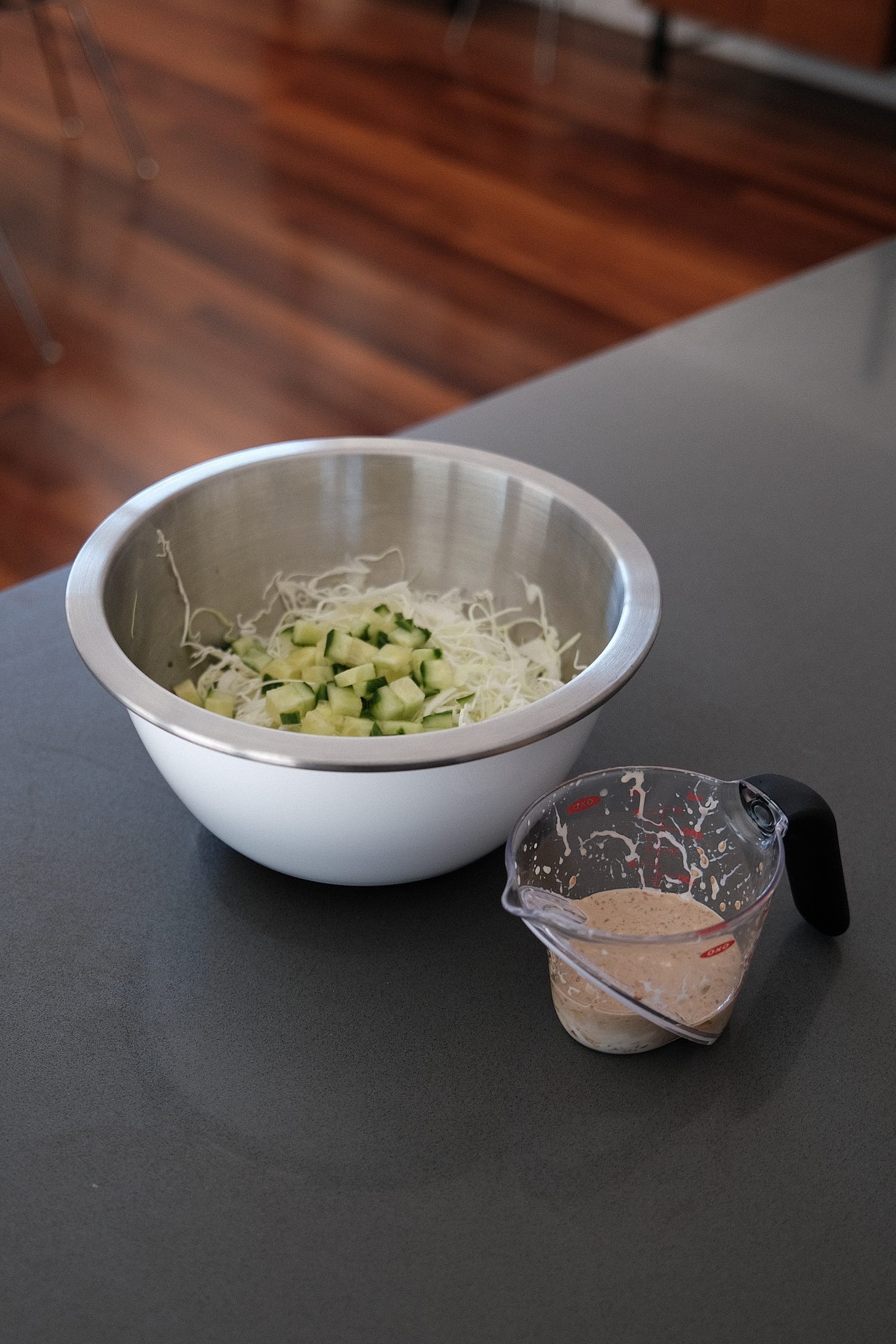If I have time, I like to throw together a quick shredded cabbage salad with some cucumber. Make sure to use a cabbage shredder or mandolin to get the cabbage extra thin! For the dressing, I’ll usually do a creamy, mayo-based dressing. Below is a guide for the dressing.